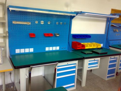 工作臺適合于模具、鉗工、檢測、維修、組裝等各種不同應用場合,具有良好的耐腐蝕性,耐臟性,抗沖擊性和承重能力強。桌面經特殊處理,具有防腐、抗沖擊力強等特點,多種桌面的選擇,可配合不同的使用要求;所配置的抽屜、柜門方便使用者存儲工具;桌角上預留電源孔,方便安裝電源插座。工作臺(桌)分為輕型(可承重300公斤),中型和重型工作臺(桌)可承重1000公斤及特制的工作臺。可根據需要靈活地配置各種吊柜、單柜、雙柜等,可加裝掛板,電器板,燈頂板、調節腳杯,輪子,擱板等桌上部件,具有多種選擇,能夠滿足各種工位的需求